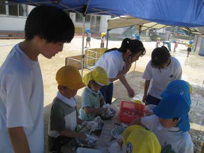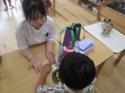 子どもたちとおままごとをしたり、外で泡遊びをしたりと積極的に関わる姿が見られました。