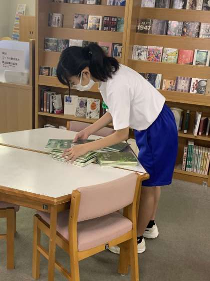 婦中図書館で活動している生徒の様子です。雑誌を順番通りに整頓したり、返却された本を書架に戻したりと仕事に励んでいました。