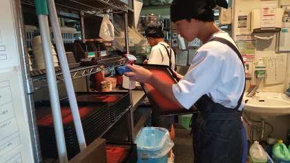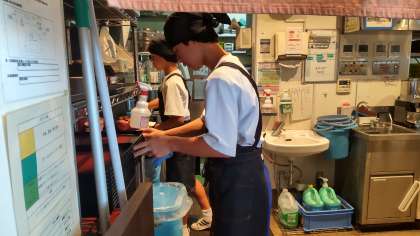 休憩直後、指示されることなく作業にとりかかり、皿やおぼんを素早くきれいに洗浄していました。