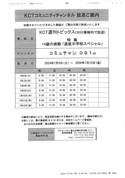 14歳の挑戦「速星中学校スペシャル」について、上婦負ケーブルテレビから放映日時の連絡がありましたので、お知らせします。