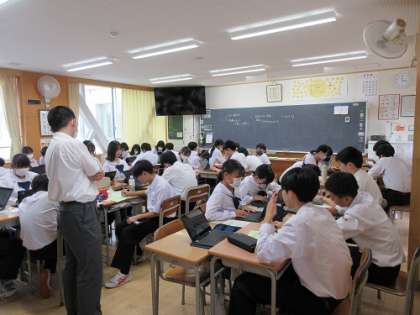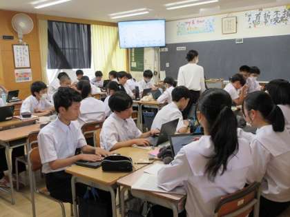 写真上から25H学活、26H社会 課題学習、23H数学の授業の様子です。
