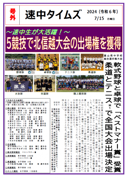 第62回富山県中学校総合選手権大会での運動部の活躍を「速中タイムズ『号外版』」として発行しました。