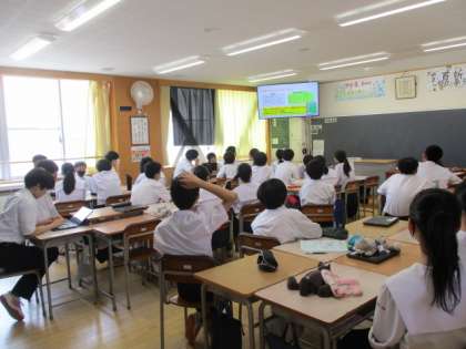 5限、富山県警察本部から講師をお招きし、リモート配信の形でスマホ・ケータイ安全教室を行いました。SNSを利用する際に気を付けなければならない点をしっかり学ぶことができました。
