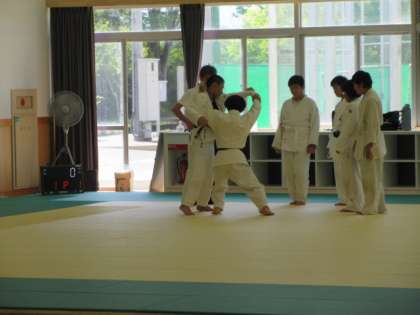 柔道部は、顧問が投げ技の入り方を指導していました。