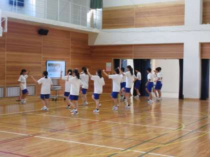 各団ごとに大型モニターを使って、体育大会の応援パフォーマンスの振り付けの練習を行っています。