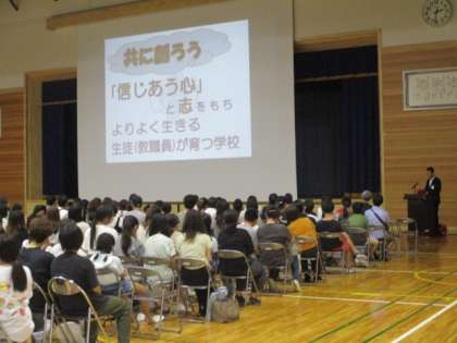 午後の公開授業の後、体育館で学校説明会を行いました。生徒会執行部の生徒は速星中学校の1日をスライドを用いて説明しました。
