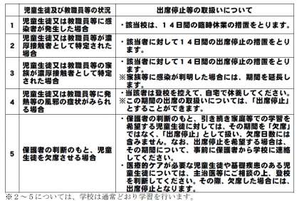 なお、今後新たな感染の発生も予測されることから、通学する学校において感染者等が確認された場合の臨時休業及び児童生徒の出席停止等の取扱いについては、次のとおりといたします。ただし、保健所から直接指示又は要請があった場合は、それに従ってください。