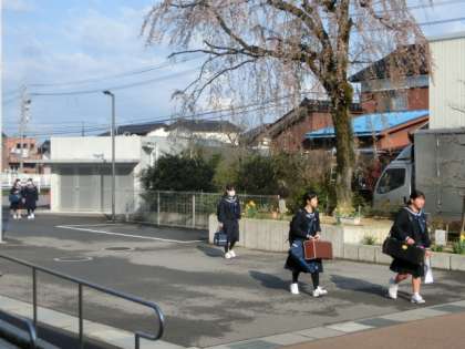 令和2年度初日。しだれ桜は残念ながら葉桜になってしまいましたが、速中生は元気に登校しました。女子は、今日から紺ネクタイです!