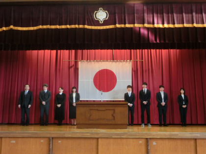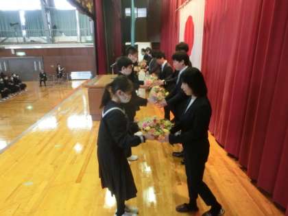 8時半から、本田元校長の退任式と異動教職員8名の離任式を行いました。コロナ対策で生徒代表の言葉は割愛しましたが、花束は渡しました。
