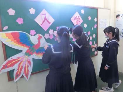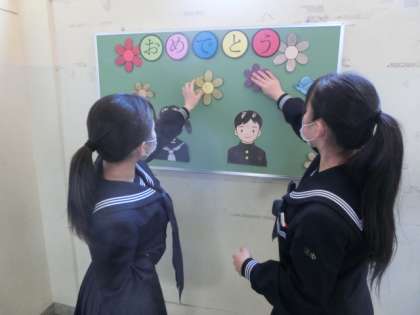 2年女子は、教室や階段踊り場の飾り付けを行いました。どのクラスも与えられた素材は同じですが、生徒たちの創意工夫によって9通りの飾り付けが出来上がりました!