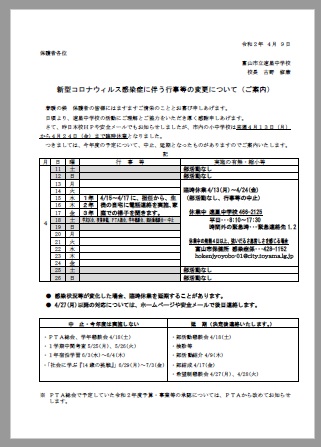 4月9日(木) 新型コロナウィルス感染症に伴う行事等の変更について(配布プリント)
