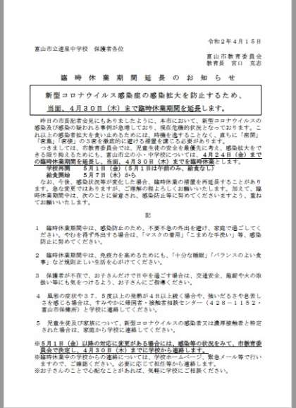 4月15日(水) 【臨時休業期間延長のお知らせ】富山市小中学校共通の内容です。