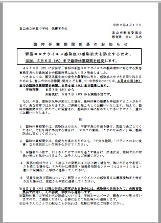 臨時休業期間延長のお知らせ 【当面、5月6日(水)まで臨時休業期間を延長】R2.4.17.15:00