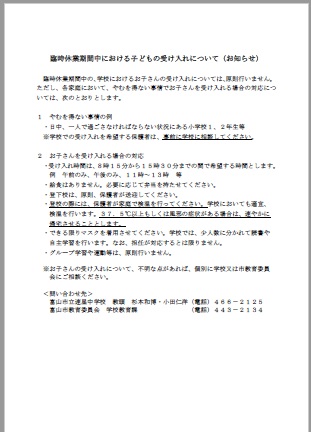 ■■臨時休業期間中における子どもの受け入れについて(お知らせ)■■
