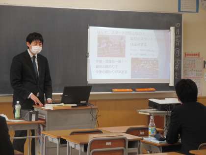本日、密にならないよう間隔を空けて「第1回若手研修会」を行いました。学級開きや授業開きで実際に話したことや、これから話す予定のことについて紹介し合いました。