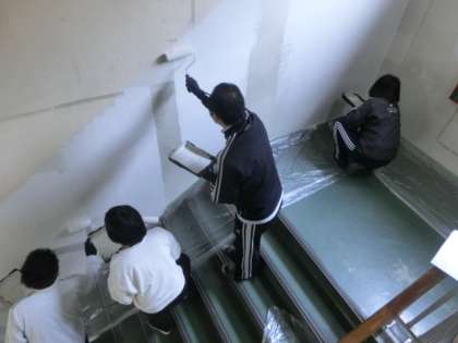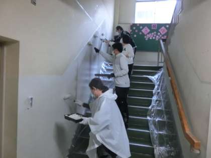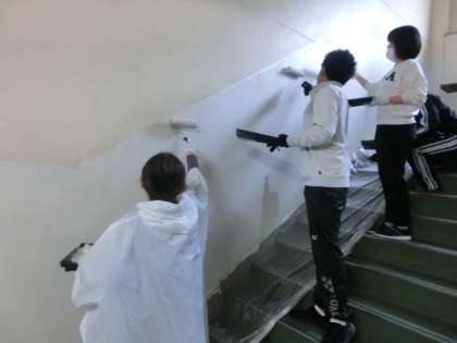 午前中、1学年担当教諭がB棟階段の壁にペンキを塗りました。おかげで、随分と明るく感じられるようになりました。登校再会に際には、ぜひ体感してみてください。
