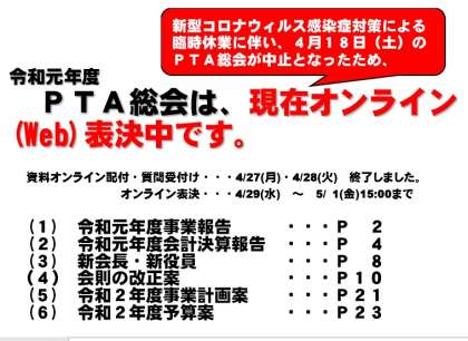 4月29日(水) PTA総会オンライン表決中です。【4/29(水)〜5/1(金)15:00まで】