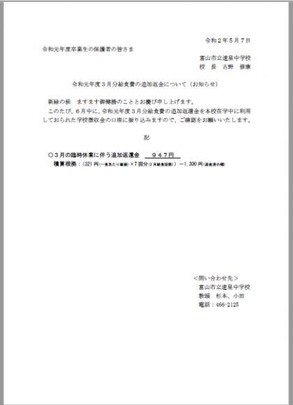 【令和元年度3月分給食費の追加返金について(お知らせ)】