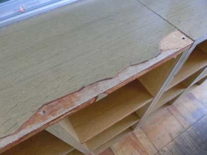 ササクレ(上段)で怪我をしないように、休業期間中に1年教室の補修を行いました。板を打ち付け(中段)、塗装を施しました(下段)。