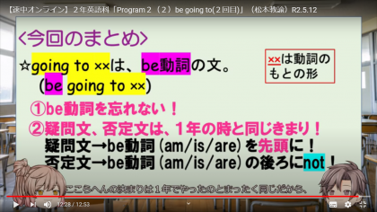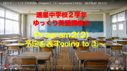 5月12日(火)、2年英語科「Program2(2)be going to(2回目)」松本教諭のオンライン授業を「生徒・保護者ページ」に掲載しました。
