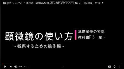 5月13日(水)、1年理科「顕微鏡の使い方〜視野に関すること編〜」 舘教諭のオンライン授業を「生徒・保護者ページ」に掲載しました。