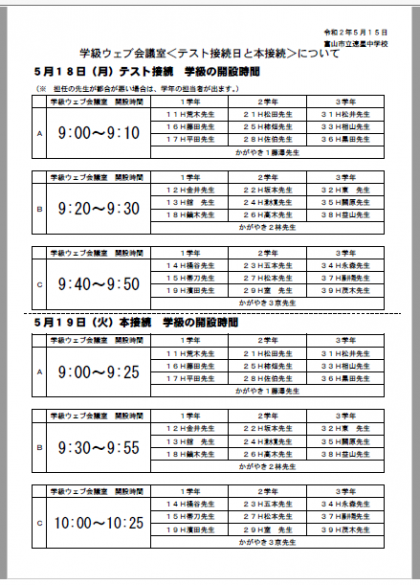 5月18日(月)と19日(火)に行われるオンライン会議システム【学級ウェブ会議室】のテスト接続・本接続の日程についてご確認ください。
