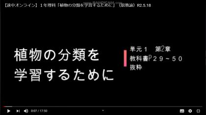 5月18日(月) 1年理科「植物の分類を学習するために」 舘教諭のオンライン授業を「生徒・保護者ページ」に掲載しました。