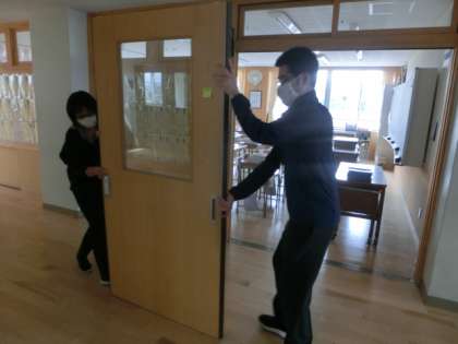 5月20日(水) 学校再開に向けて 公開日 2020/05/20 更新日 2020/05/20 全学年 分散登校開始に当たり、接触感染を避けるために(取っ手に触らなくてもよいよう)教室のドアを外したり、トイレにソーシャルディスタンスを意識するための目印を設置したりしました。 他にも、消毒液を準備するなど、生徒が安心して登校できるよう様々な工夫をしていきます。