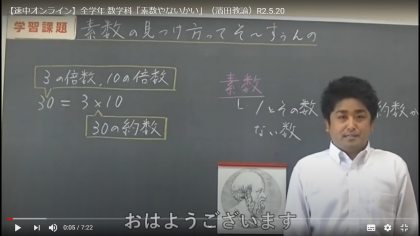 5月20日(水) 全学年 数学科「素数やないかい」 濱田教諭のオンライン授業を「生徒・保護者ページ」に掲載しました。