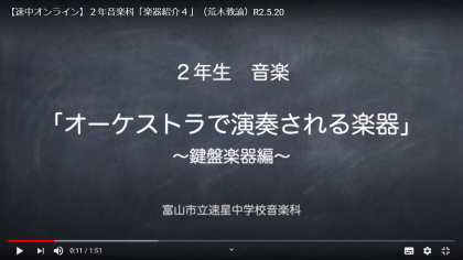 5月20日(水) 2年音楽科「楽器紹介4」 荒木教諭のオンライン授業を「生徒・保護者ページ」に掲載しました。