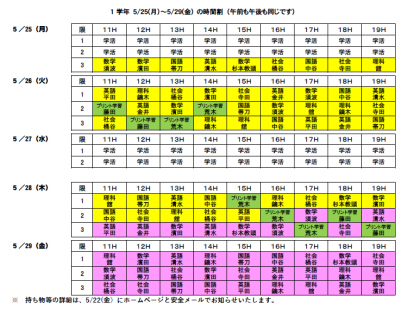 5月21日(木) 【1学年】 5/25(月)〜5/29(金) の時間割について