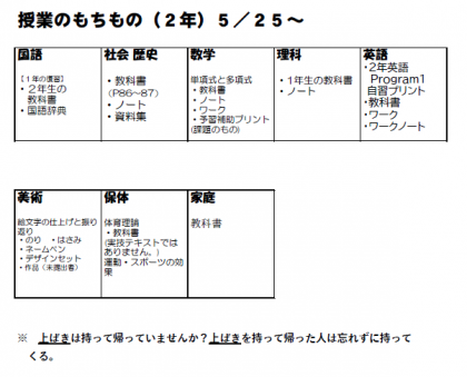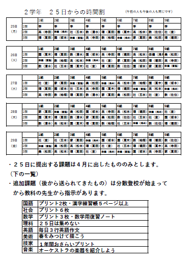 5月21日(木) 【2学年】 5/25(月)〜5/29(金) の時間割について