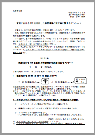 これを受け、富山市教育委員会より、「家庭におけるICTを活用した学習環境の現況等に関するアンケート」への協力依頼がありました。つきましては、回答にご協力いただき、5月29日(金)まで担任にご提出ください。