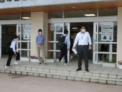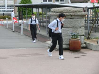 日差しは強いものの心地よい風が吹く中、Bチーム(偶数)の生徒たちが元気に登校しました。玄関では、爽やかな挨拶が響き渡りました。