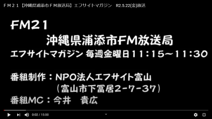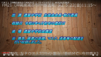 5月26日(火)、FMラジオ(FM21・沖縄県浦添市)の番組に、本校の生徒会長・執行委員が出演しました。番組制作は、富山市にあるNPO法人エフサイト富山が行っています。令和元年度から、演劇部の生徒が出演したり学校紹介を行ったりしています。