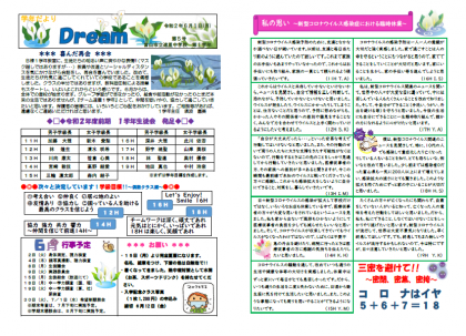 1学年だより第5号をアップしました。内容は、学年主任の巻頭言、1学年生徒会のメンバー紹介、偶数クラスの学級目標、6月の行事予定、「私の思い〜新型コロナウイルス感染症における臨時休業〜」生徒の作文です。