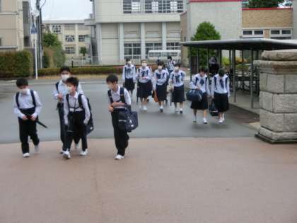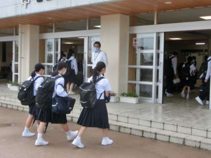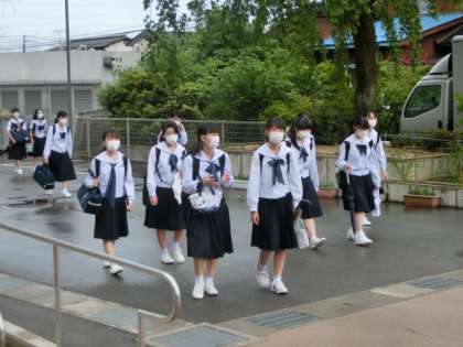 通り雨がありましたが、速中生は今朝も元気に登校しました。分散登校のときは一緒に登校できなかった友達と一緒に登校することができて、楽しそうでした。