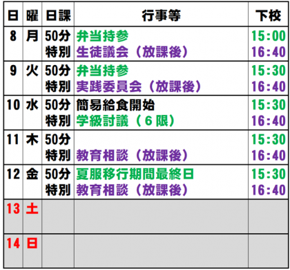 下校時刻は、最速で上段(緑色)の時刻、最大延長でも下段(紫色)の時刻となります。