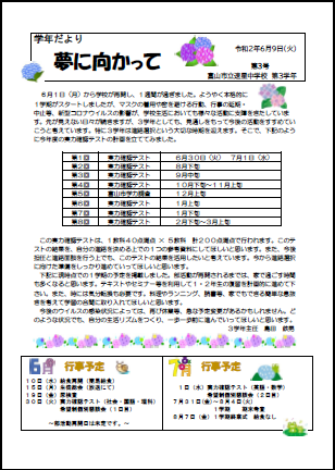 3学年だより第3号(6月)をアップしました。内容は、学年主任の巻頭言、実力テスト実施計画、行事予定です。