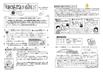 保健だより第3号(6月)をアップしました。内容は、新型コロナウィルス感染症対策継続のお願い、熱中症対策について、給食後の歯みがきについて、健康診断の日程等です。