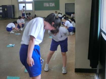下段は、3年女子の体育です。握力や長座体前屈を測定しました。