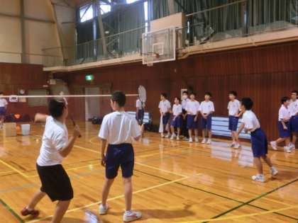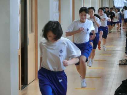 仮入部2日目。雨のため、外部の多くが廊下や階段を使ってトレーニングをしました。上段は男子バドミントン部、中段は陸上競技部、下段は家庭科部の様子です。