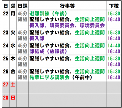 来週から、「配膳しやすい給食」が始まります。全日45分の短縮校時で、下校完了時刻は16時40分です。