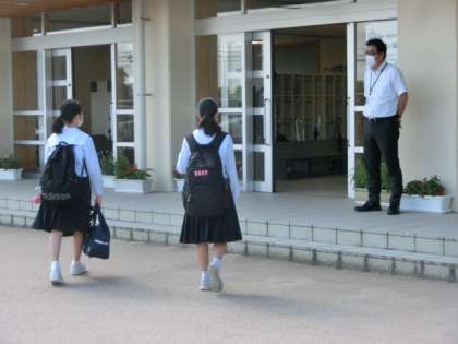 日差しが眩しい天候の下、速中生は今朝も元気に登校しました。額に汗を浮かべている生徒も大勢いました。