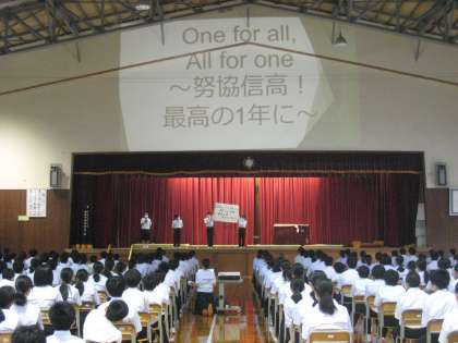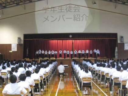 1年生は、4限目に学年集会を行いました。最初に、学年生徒会のメンバー紹介をし、次に各学級の学級目標の紹介、学年目標の紹介をしました。