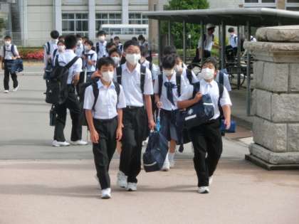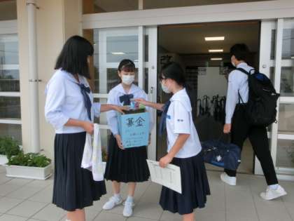 玄関では、今朝からボランティア委員会の生徒によるコロナウィルス募金が始まりました。初日から、たくさんの生徒や教員が募金しました。7月3日までの募金は日本赤十字社へ、7月6日〜10日までの募金は日本動物愛護協会へ寄付します。