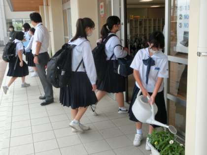生活向上週間4日目(ノーチャイムデー1日目)。日差しがジリジリ照り付ける中、生徒は今朝も元気に登校しました。ボランティア委員会の生徒は花の水やりを行いました。
