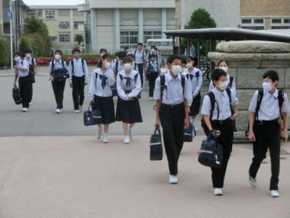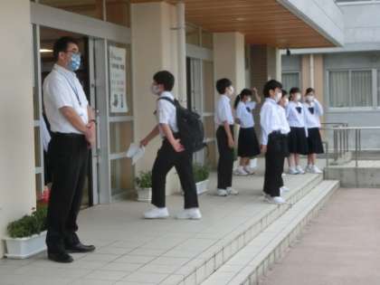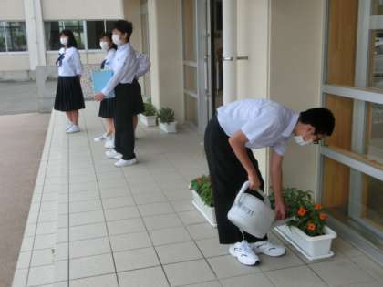 6月最終週の初日。心地よい風が吹く中、生徒は元気に登校しました。玄関では、生活向上委員会の1年生が爽やかな挨拶で全校生徒を出迎えました。ボランティア委員会の生徒は、水やりとコロナ募金を行いました。