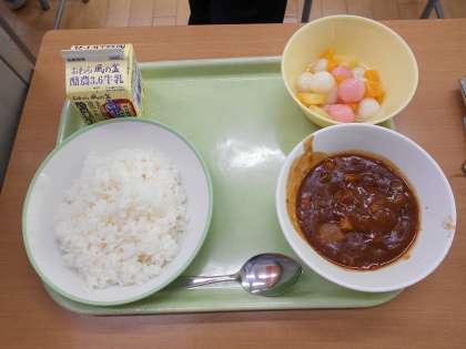 今日の給食は、牛乳・ハヤシライス・ご飯・フルーツ白玉でした。ハヤシライスは、デミグラスソースの香りが食欲をそそり、フルーツポンチは、爽やかなフルーツの甘みと白玉のもちもちした食感が、まるで「あの夏の日」のようでした。