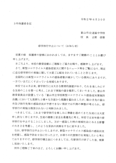 6月30日(火) 配布文書 修学旅行の中止について・富山市キャンセル料全学負担の方針へ